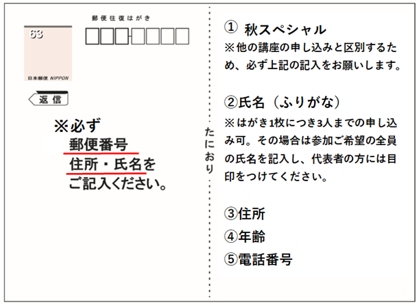 ■申込方法/申込フォーム、または、往復はがきに以下の内容を記入して送付