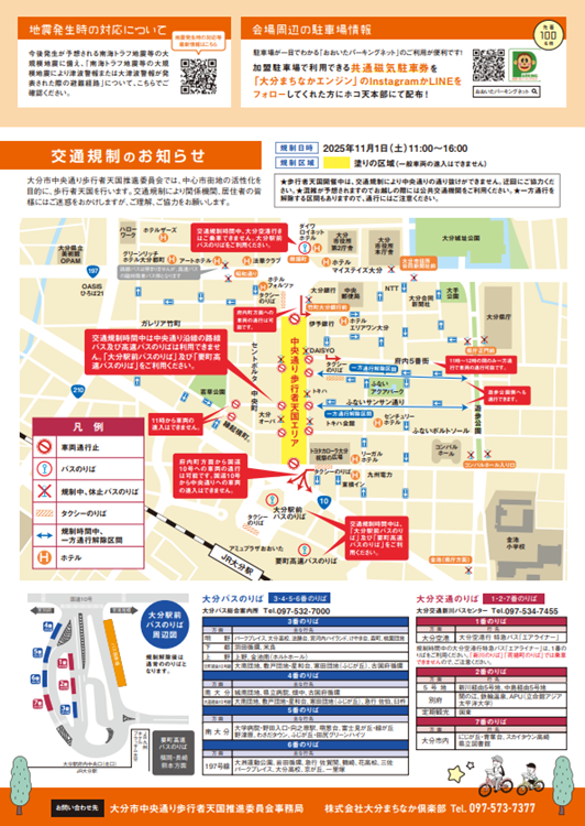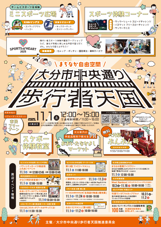 「第23回大分市中央通り歩行者天国」を11月1日(土)12時~15時まで開催します。市民フリーゾーンでのパフォーマンスやミニトレインぶんぶん号の運行、プロスポーツ選手によるスポーツ体験などを行います。