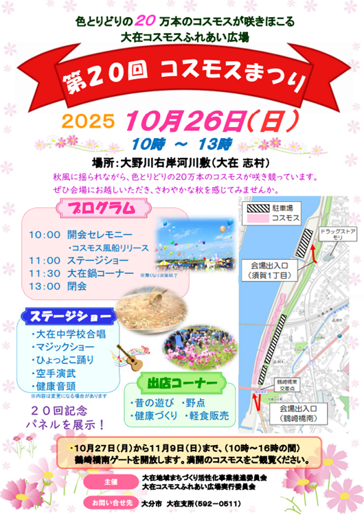 地域内外の人々のふれあいと健康づくりの場として、10月26日(日)に大在コスモスまつりを開催します。今年で大在コスモスまつりは20回目を迎えます。地元の人が丹精込めて育てたコスモスを観賞していただき、また、ステージ発表や健康づくりコーナー、昔の遊びコーナーなどさまざまなブースを用意しております。皆様のお越しをお待ちしております。