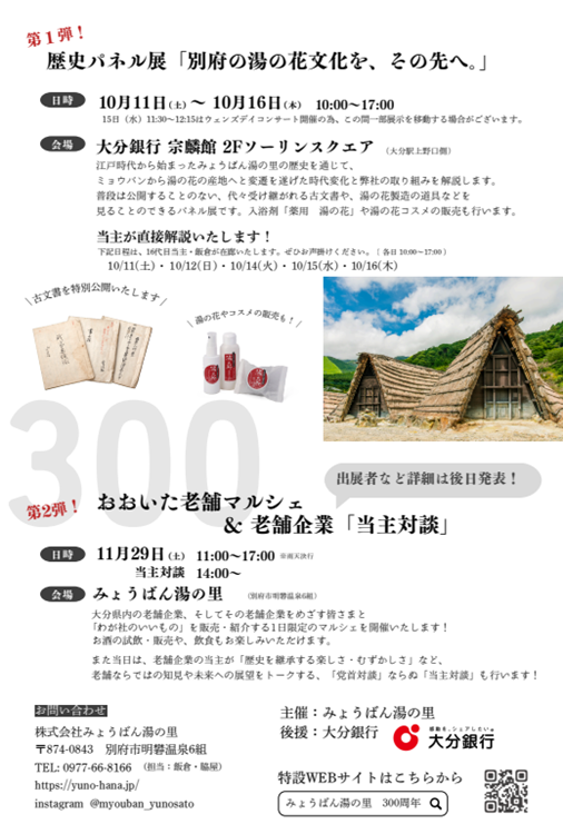 これを記念して、湯の花の魅力やみょうばん湯の里の歴史・取り組みを広く知っていただくため、歴史パネル展「別府の湯の花文化を、その先へ。」を開催します。普段は、公開することのない、代々受け継がれる古文書や湯の花製造の道具などもご覧いただけます。ぜひ、お出かけください。