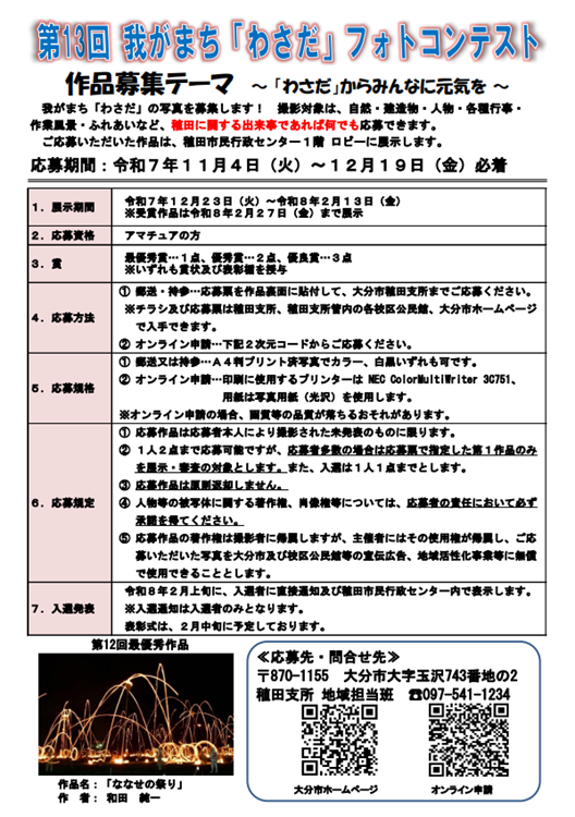 大分市では、地域の豊かな自然や歴史に触れることで我がまちへの関心、愛着を深めること等を目的として、『我がまち「わさだ」フォトコンテスト』を実施しています。