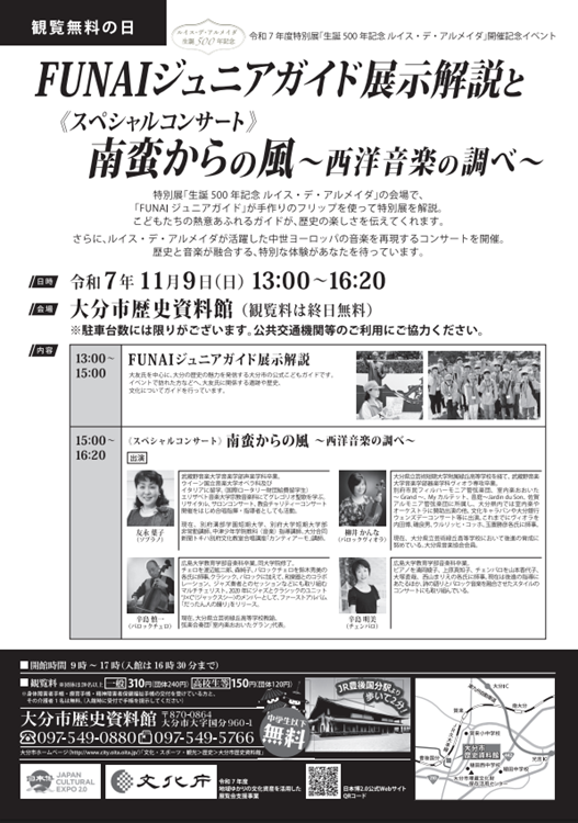 アルメイダの魅力をより感じていただけるよう、特別展「生誕500年記念 ルイス・デ・アルメイダ」の開催期間中の11月9日(日)の観覧料を終日無料とし、関連イベントを開催します。