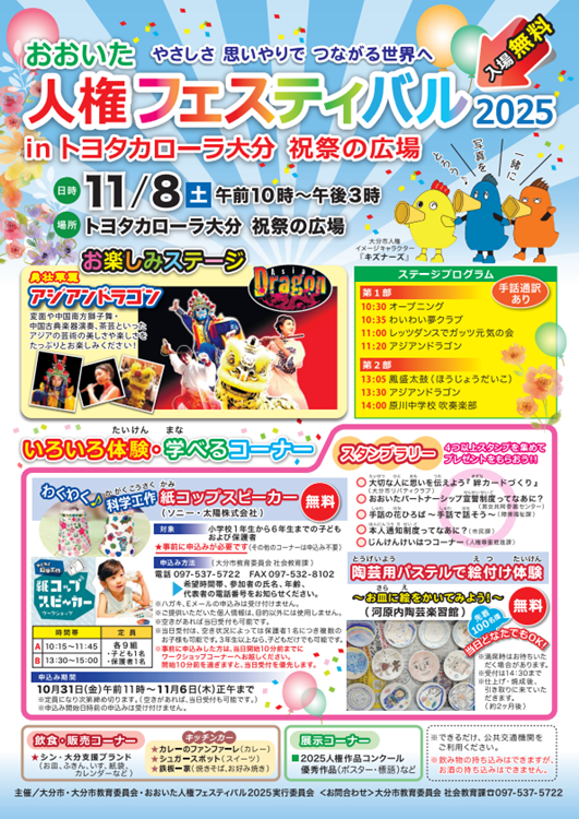 大分市では、大分市人権教育・啓発基本計画に基づき、あらゆる差別の解消に向けて、「おおいた人権フェスティバル」を年間を通して市内各地で開催しています。今回は、トヨタカローラ大分 祝祭の広場で開催します。団体等のステージ発表や人権について学べるスタンプラリーなど、お子さんから大人まで、楽しみながら参加できる内容になっています。皆様のご来場をお待ちしています。