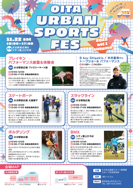 アーバンスポーツの競技人口や裾野の拡大を図ることを目的として、各種アーバンスポーツを体験・体感できるイベント「OITA URBAN SPORTS FES 2025 act1 autumn」を開催します。ブレイキンのパフォーマンス披露のほか、ブレイキンやスケートボード、ボルダリング、スラックライン、BMXの体験会を実施します。