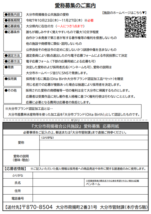 ・ご記入いただいた個人情報は、本事業実施に係る事務以外には使用しません。ただし、採用者の氏名(またはペンネーム)は大分市ホームページ等で公表します。