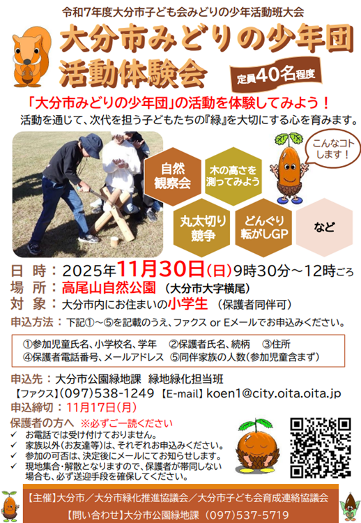 大分市内のみどりの少年団と一緒に、自然観察や丸太切り競争などの活動を体験するイベントです。草木や花などに興味のある小学生、高尾山の自然に親しんでみませんか?