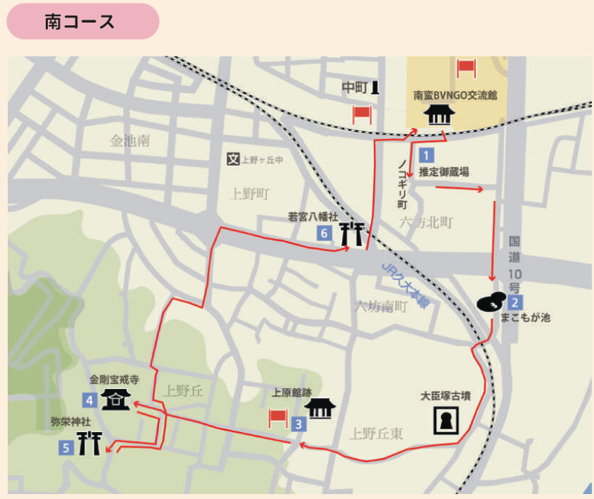 鎌倉時代からの大友氏活躍の場である上野を歩きます。北コースに比べて2倍近い距離があり、更に坂を上るので歩きに自信がある方向けのコースです。