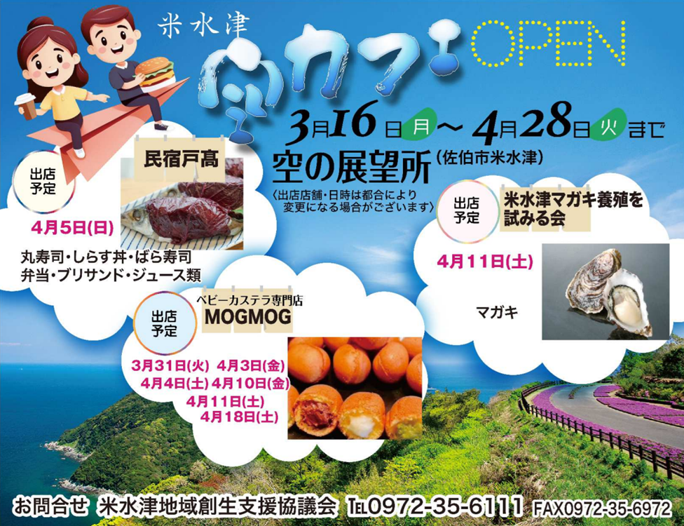 空の展望所(米水津)では、3月下旬から芝桜が咲き始め4月に見頃を迎えます。芝桜の開花にあわせて3月16日(月)~空カフェをOPENします。空カフェでは地域の特産品等を販売しますので、訪れた際は是非お立ち寄りください。詳細はチラシ[PDF:205.8KB]をご確認ください。