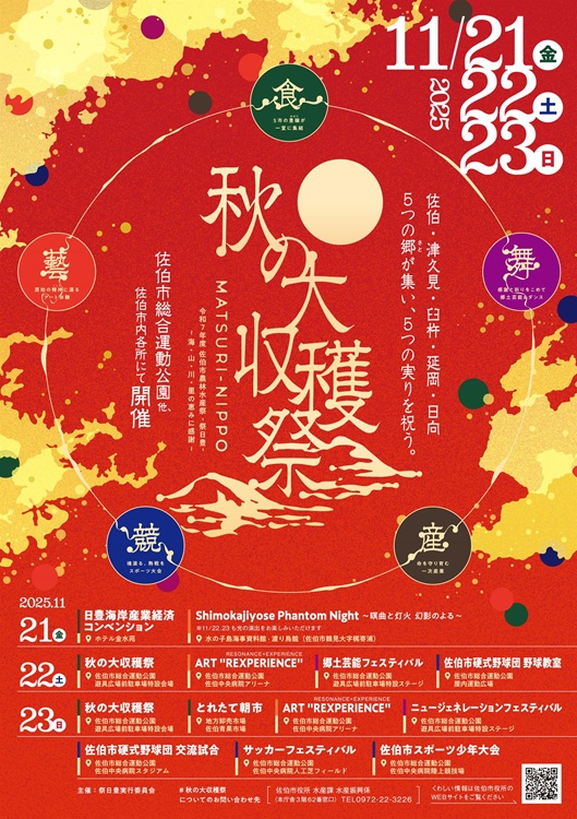 MATSURI – NIPPO 秋の大収穫祭 ~海・山・川・里の恵みに感謝~を開催します。佐伯・津久見・臼杵・延岡・日向5つの郷が集い、5つの実りを祝います。ぜひご来場ください。