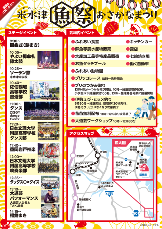 鮮魚や干物等の米水津地域自慢の海の恵みを楽しめるほか、子どもからお年寄りまで広く楽しめる会場内イベントやステージショーが盛りだくさんの内容になっています!会場内では市内外飲食店や露店、県内人気のキッチンカーもたくさん出店します!ぜひご家族おそろいでお越しください!