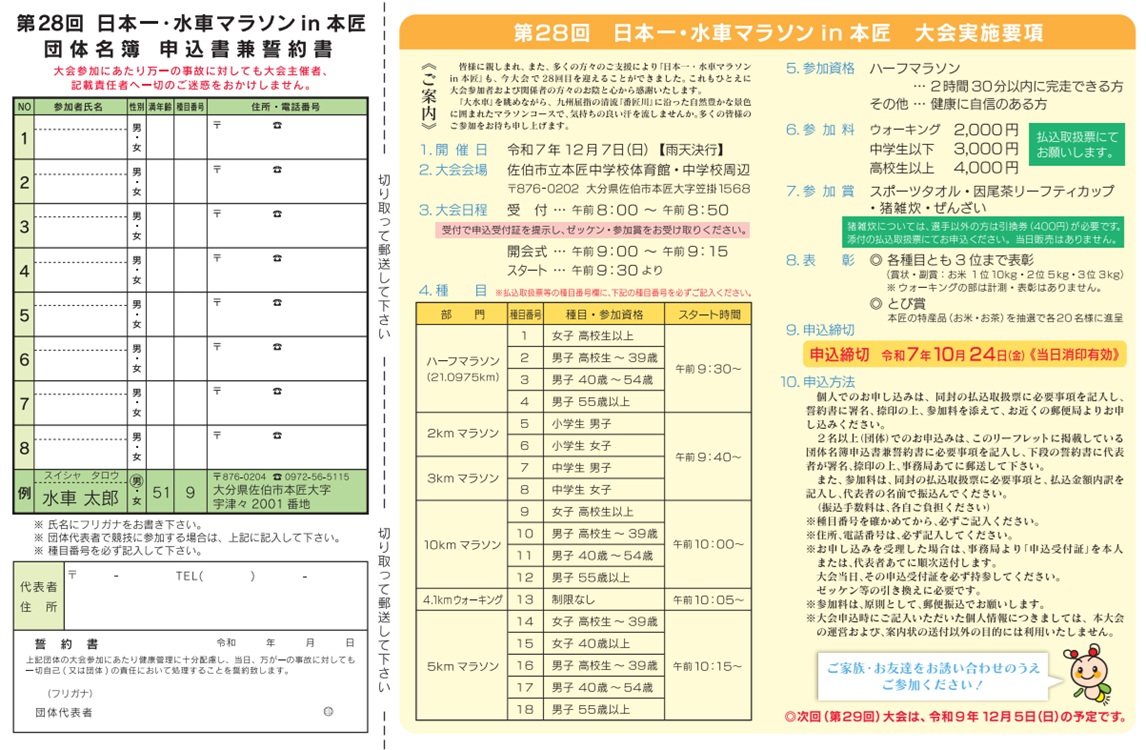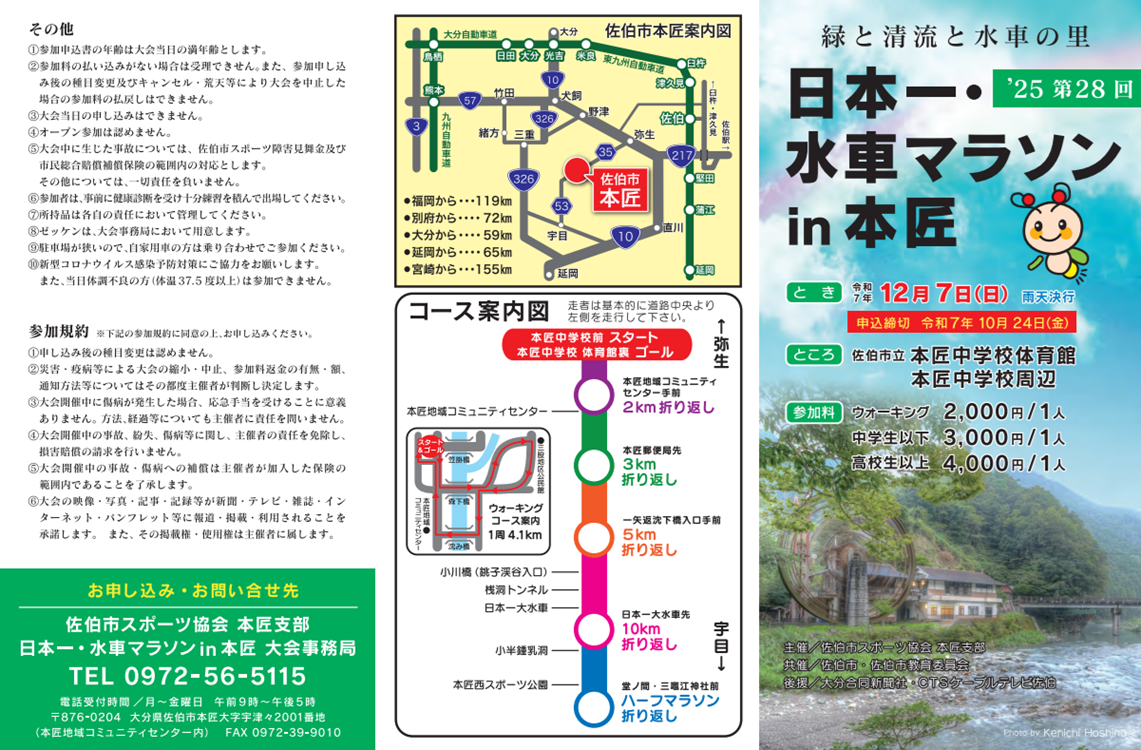 「日本一の大水車」を眺めながら、九州屈指の清流「番匠川」に沿った本匠路を駆け抜けるマラソン大会に参加してみませんか。県外者の募集も行います。水車マラソン名物の猪雑炊・ぜんざいをご賞味ください。