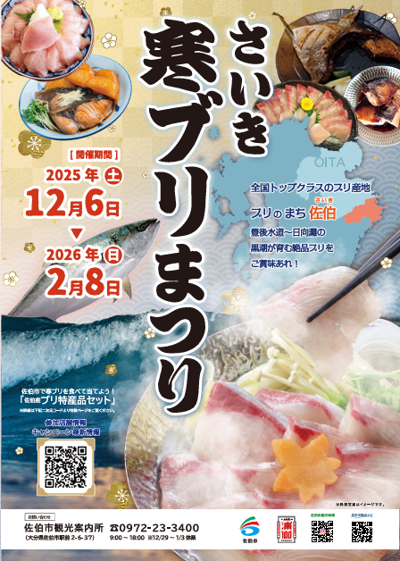 佐伯市ではこの冬、旬の食材「寒ブリ」をテーマに、地元ならではの魅力を発信するキャンペーン「さいき寒ブリまつり」を初開催いたします。市内の飲食店や宿泊施設と連携し、佐伯産寒ブリを使った特別メニューを期間限定でご提供。佐伯の冬の味覚をきっかけに、地域の魅力を再発見していただける催しです。ぜひこの機会に佐伯へお越しください。