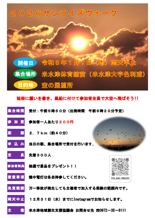 元旦に米水津で「サンライズウォーク」を開催します。米水津湾を眼下に見下ろしながら、2.7kmの「豊後くろしおライン」を歩いて空の展望所を目指します。短冊に願いを書いて、大空へ風船を飛ばしましょう!