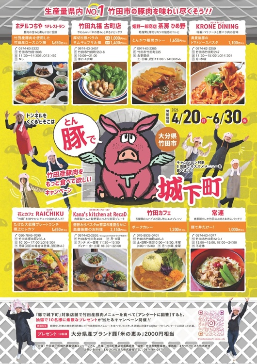 キャンペーン期間中、対象の飲食店8店舗で「竹田産豚肉メニュー」をお食事いただき、店舗に設置しているQRコードからアンケートに回答していただいた応募者の中から抽選で10名様に大分ブランド豚「米の恵み」2000円相当をお贈りします!皆さまの参加をお待ちしております♪