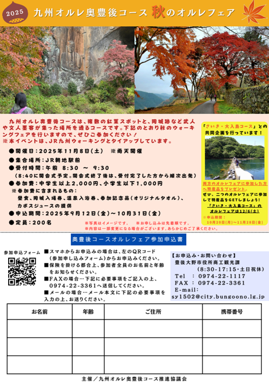 九州オルレ奥豊後コースで、「秋のオルレフェア」を開催いたします。紅葉の名所を巡る奥豊後コースを歩いて楽しめます。ぜひご参加ください!