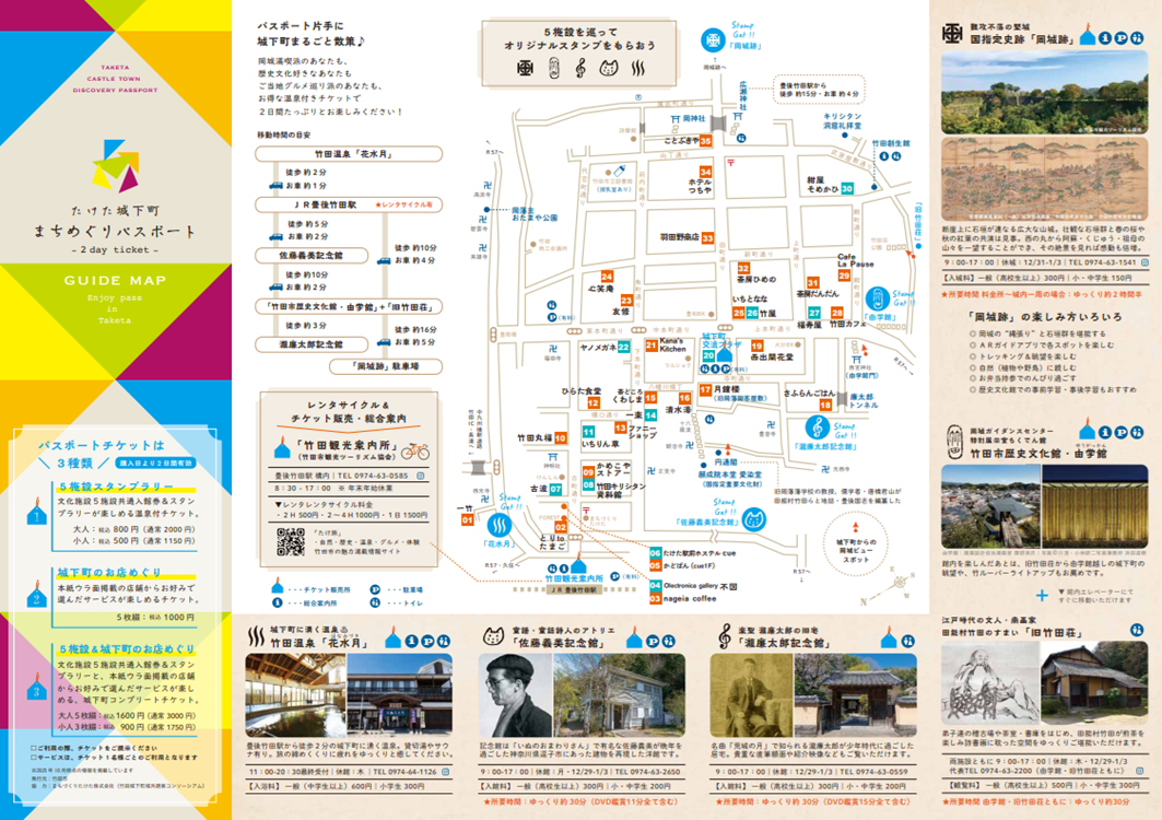 岡城跡や歴史資料館をはじめとする文化施設5館を巡り、スタンプを集めながら竹田の歴史文化を体感できます。温泉入浴券付きで、まち歩きの疲れを癒やせるのも嬉しい特典です。