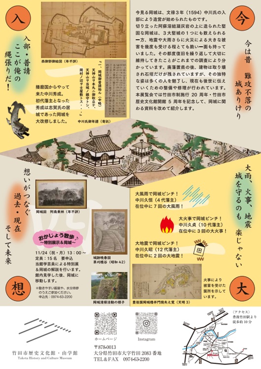 岡城は、中川氏の入部以来、幾多の災害を乗り越えて多くの方の手により守られてきました。廃藩置県の後、建物は取り壊され石垣だけが残されていますが、現在も各世代から竹田市を代表する施設として大切にされており、後世に伝えていくための整備や修理が行われています。今回の展覧会では、本市に遺された岡城に関わる資料を改めて紹介し、その魅力を再発見していただきます。