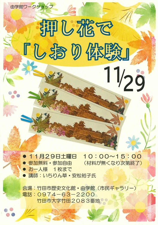 岡城が描かれた紙に押し花をのせて、ラミネートでとじます。好きなお花で彩られた岡城しおりをぜひ作りましょう!