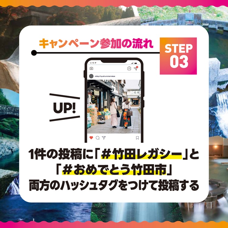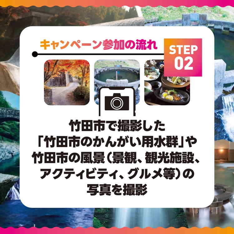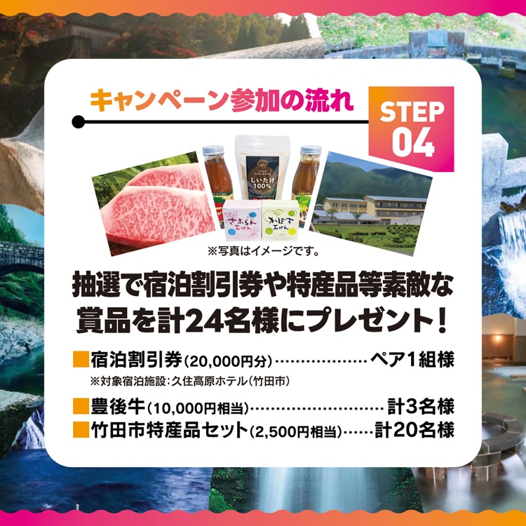竹田温泉花水月の公式アカウントをフォローのうえ、竹田市で撮影した「竹田市のかんがい用水群」や「竹田市の風景(景観、観光施設、アクティビティ、グルメ等)」の写真をハッシュタグ「#竹田レガシー」と「#おめでとう竹田市」とつけて投稿した方に、抽選で素敵な賞品をプレゼント!