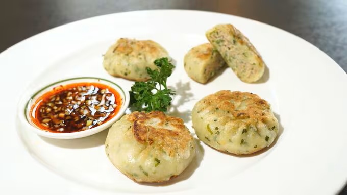中華料理の「花茶」ではユニークな「ねぎとろギョーザ」(600円)を考案しました。ねぎとろにカボス果汁を加え、ギョーザの具をもち粉の皮で包んだ自信の一品です。
