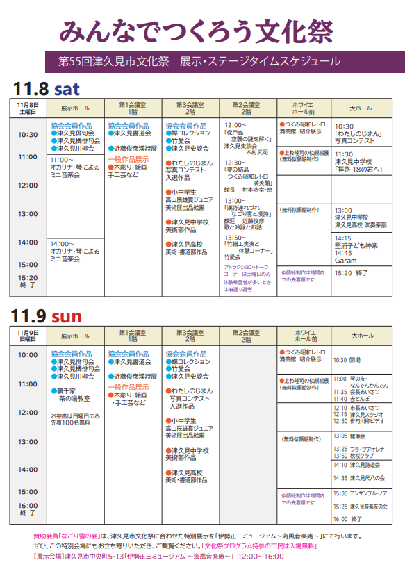 文化協会会員による舞台発表や作品展示のほか、吹奏楽、美術、書道、絵画など小中高校生や一般市民の皆さんの出展もあります。また、津久見史談会の講話、昭和レトロ満英館のあゆみ、漢詩人・麟涯(りんがい)近藤俊彦氏によるお話など、多彩なプログラムがあります。入場無料です。 この機会に、津久見の文化と芸術にふれてみませんか?