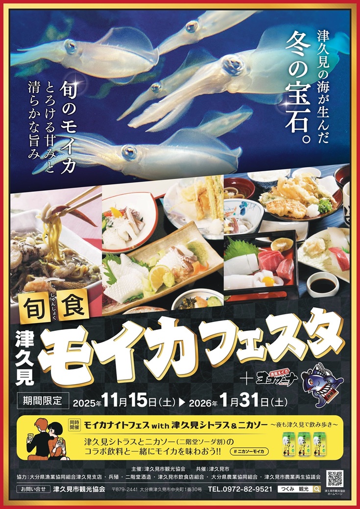 昨今、モイカは数あるイカの中でも、独特の甘みと食感があることから、『イカの王様』と呼ばれており、高級食材として取扱われています。津久見モイカフェスタは、漁師・漁協・料理人が一体となって開催します。津久見のモイカを漁師が丁寧に獲り、漁協がモイカ専用イケスで管理し、料理人が鮮度抜群のモイカを調理して、皆様にお届けします。