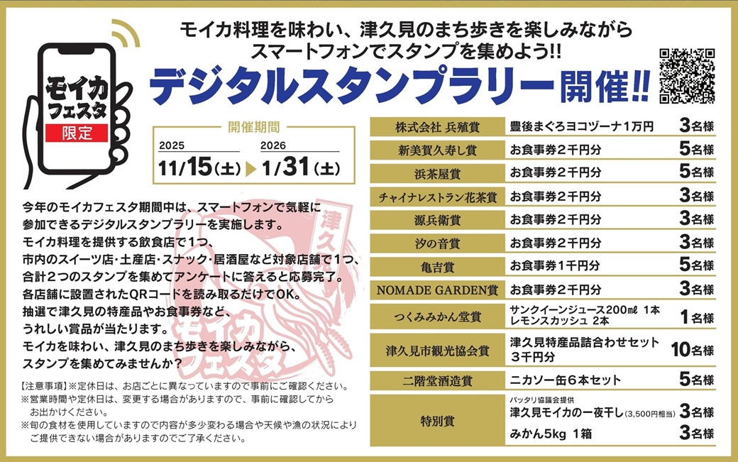 モイカ料理を味わい、津久見のまち歩きを楽しみながらスマートフォンでスタンプを集めよう!!