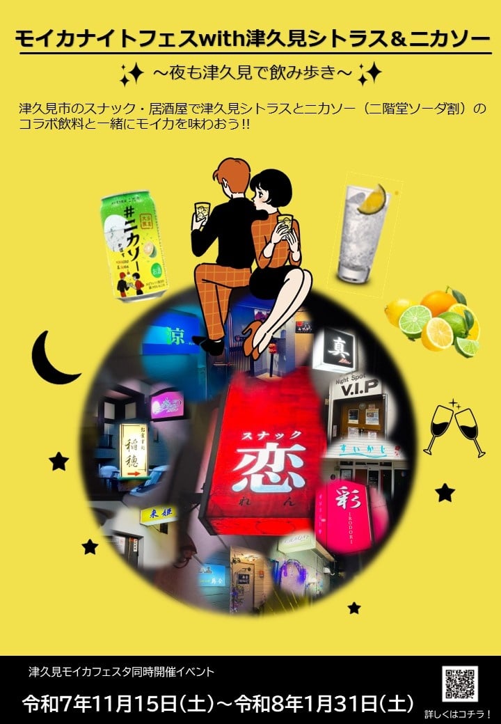 モイカフェスタ期間中、ニカソー(二階堂ソーダ割)とのコラボによるイベントを開催します。津久見産シトラス等柑橘類と合わせて提供したり、ニカソーとのセットメニューやモイカを使用した一品料理を提供します(対応可能店舗のみ)。