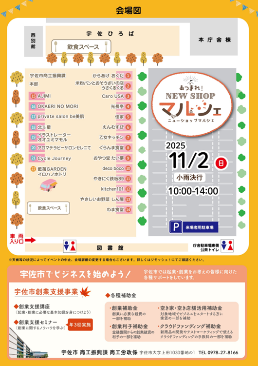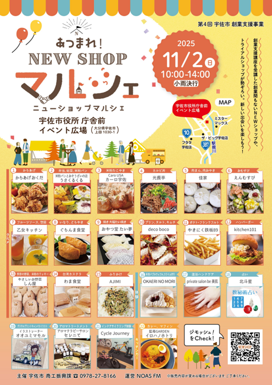 昨年、第3回目のNEWSHOPマルシェを開催しました。初出店した店舗は25店舗中14店舗。前日の大雨で心配しましたが天候にも恵まれ、宇佐市内外から大勢のお客さまに来て頂き、大盛況のうちに終了しました。