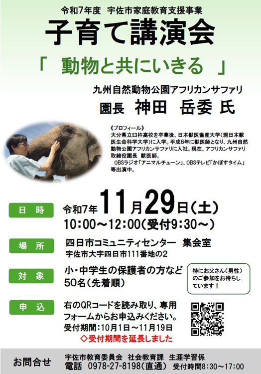 講師には、OBSテレビ「かぼすタイム」等でお馴染みの、九州自然動物公園アフリカンサファリ園長で獣医師の神田岳委先生をお招きします。
