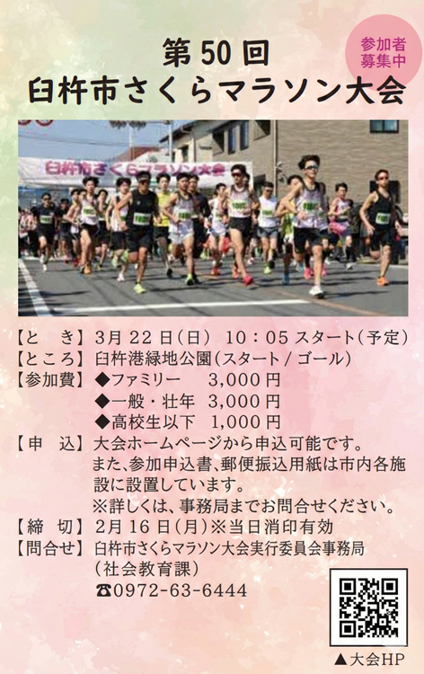 ■参加申込/大会ホームページのエントリーページから申込、または参加申込書、郵便振込用紙は臼杵市内各施設に設置しています。