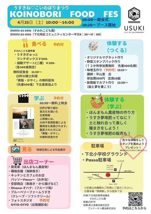 ユネスコ食文化創造都市である臼杵の食文化の魅力が詰まった多世代交流イベントです。限定ランチボックス販売や映画『100年ごはん』の上映会、うすき夢堆肥を使った種まき体験など、観て・食べて・楽しく学べます。大林千茱萸監督の講演もあります。