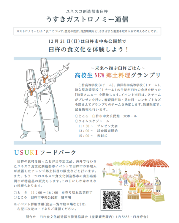 臼杵の食材を使ったお弁当や加工品、海外で行われたユネスコ食文化創造都市イベントで臼杵市の料理人が披露したアレンジ郷土料理の販売などを行います。また、もう一つのユネスコ食文化創造都市の山形県鶴岡市が特産品の販売もします。この日にしか味わえない料理もあります。