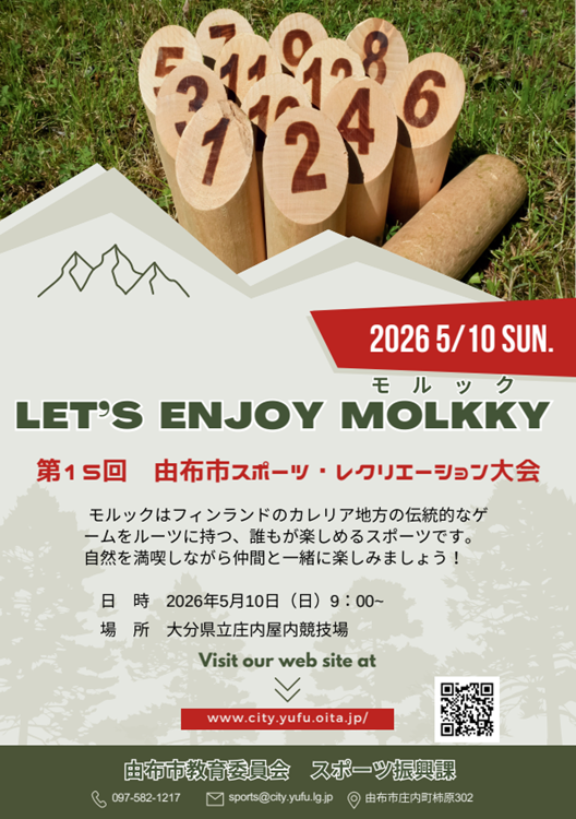 令和8年度県民すこやかスポーツ祭として、第15回由布市スポーツレクリエーション大会でモルック大会が5月10日(日)に開催されます。