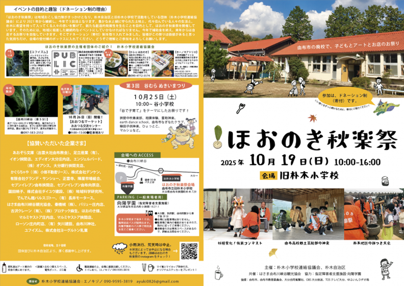由布市の廃校を舞台に、子どもとアートとお店が集まるお祭りです。豊かな自然と水に恵まれた土地で、地元の暮らしや文化を感じながら、新たな交流と創造を育むイベント。朴木地区で育ったお米を届ける「ホオノキ米販売プロジェクト」の申込受付も行われます。見て、遊んで、食べて、ゆったりと過ごせる一日をぜひお楽しみください。