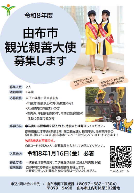 令和8年度由布市観光親善大使を募集します。
